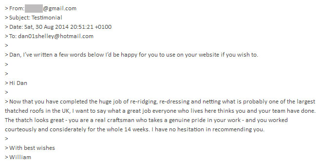 Dan, I’ve written a few words below I’d be happy for you to use on your website if you wish to. Hi Dan Now that you have completed the huge job of re-ridging, re-dressing and netting what is probably one of the largest thatched roofs in the UK, I want to say what a great job everyone who lives here thinks you and your team have done. The thatch looks great - you are a real craftsman who takes a genuine pride in your work - and you worked courteously and considerately for the whole 14 weeks. I have no hesitation in recommending you. With best wishes William