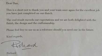 “Dear Dan, This is a short note to thank you and your team once again for the excellent job you have just completed on our thatch. The end result exceeds our expectations and we are both delighted with the finish, the designs and the craftmanship. Please feel free to use us as reference should you need one in the future.”